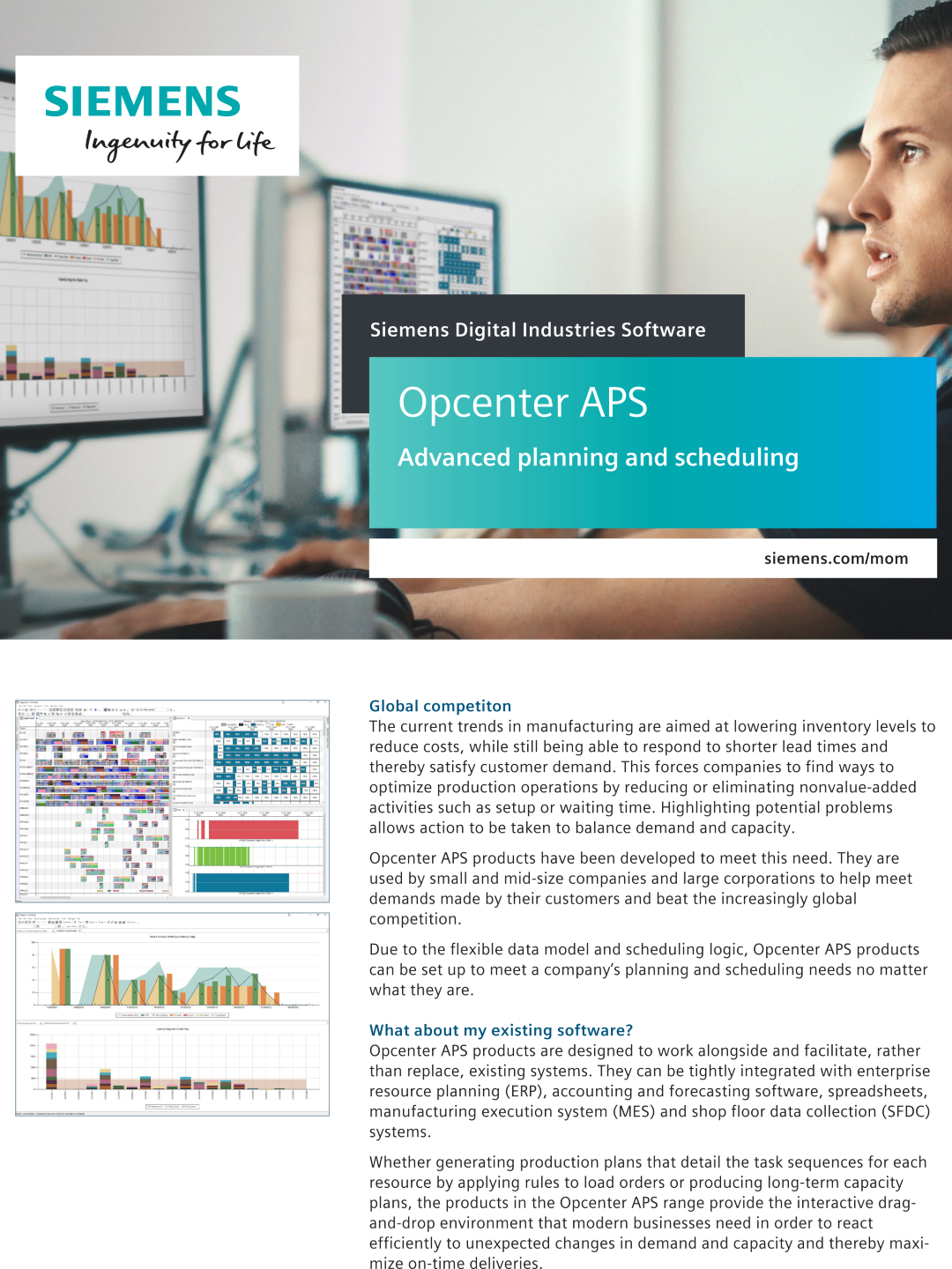 Opcenter APS products are designed to work with and facilitate existing systems, rather than replacing them. They can be integrated with existing Enterprise Resource Planning (ERP), Manufacturing Execution System (MES), accounting and forecasting software, shop floor data collection and spreadsheets.
